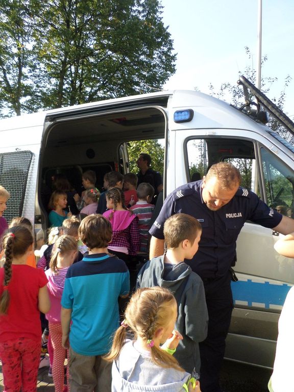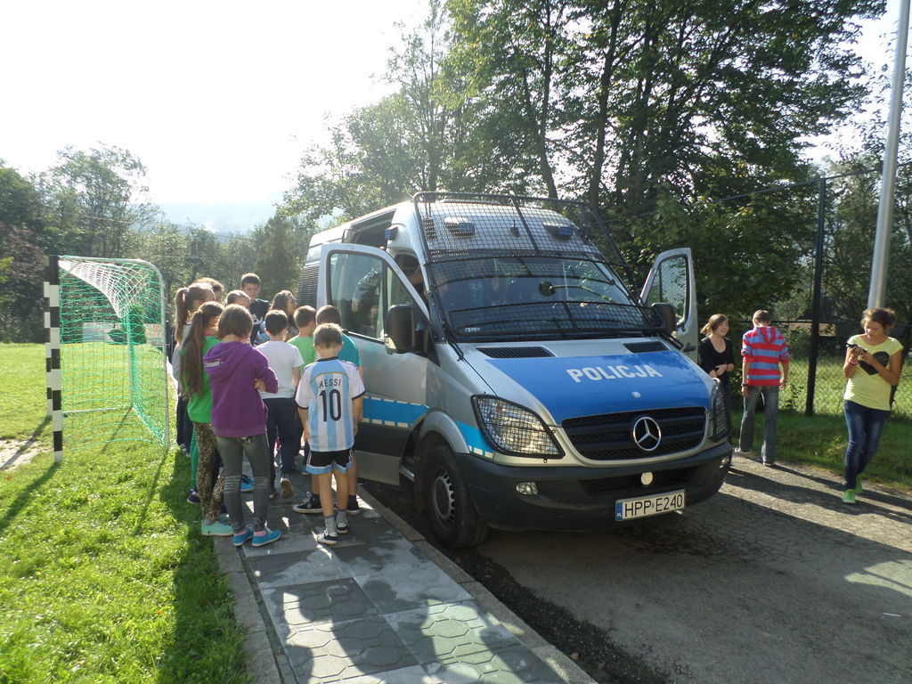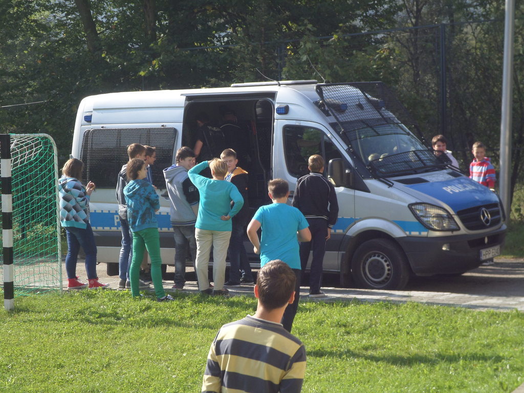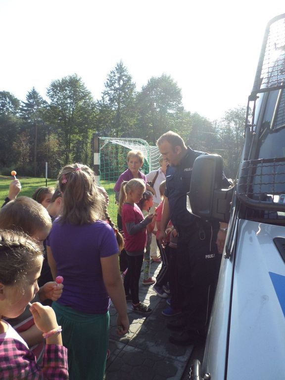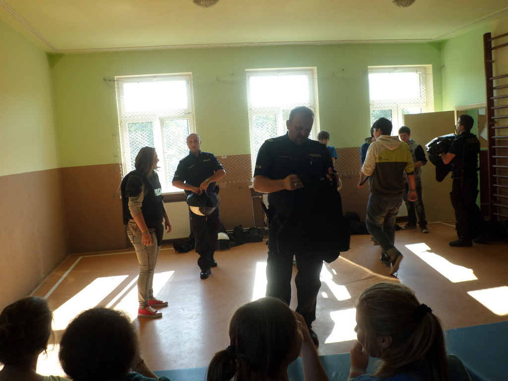 W środę 17 września 2014 r. odwiedzili naszą szkołę policjanci. Spotkanie zostało podzielone na dwa bloki: w pierwszym z nich uczestniczyli uczniowie klas 0-V, w drugim uczniowie klas VI - III gimnazjum. Podczas spotkania uczniowie dowiedzieli się o tym, jak bezpiecznie poruszać się po drogach, jak reagować, gdy pojawią się sytuacje dotyczące narkotyków. Szczególnym zainteresowaniem wśród dzieci i młodzieży cieszyła się prezentacja wyposażenia policyjnego niezbędnego podczas wykonywania pracy.