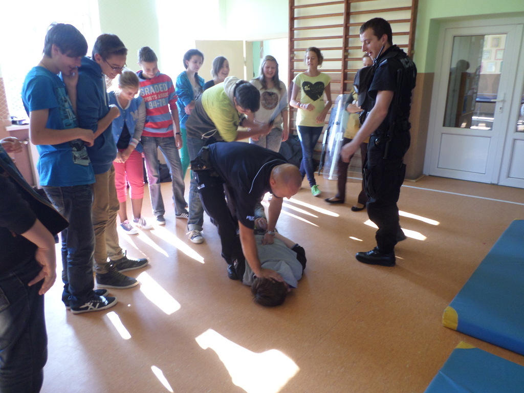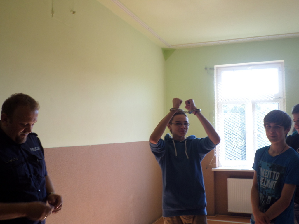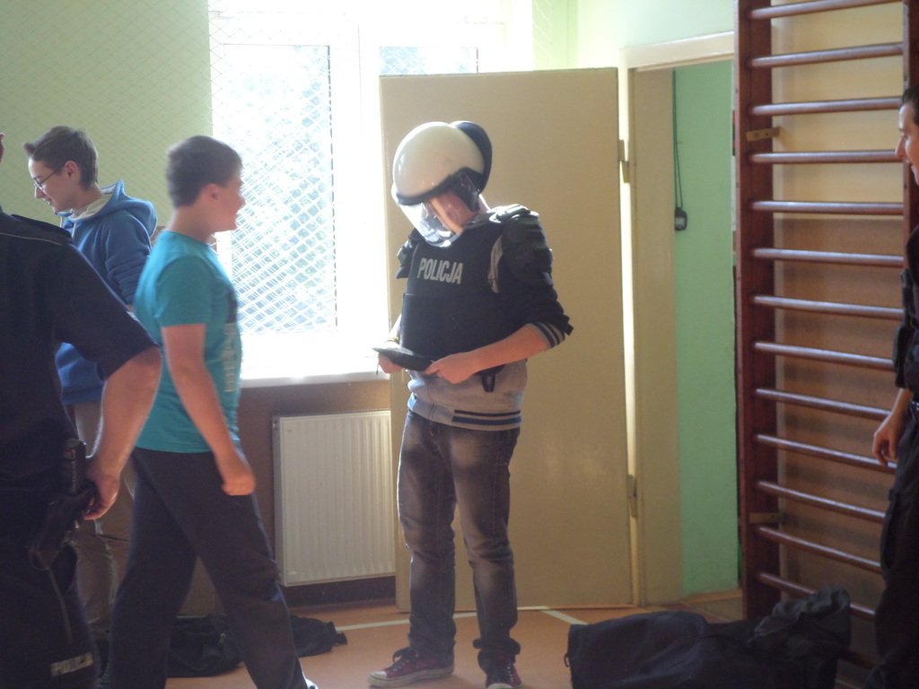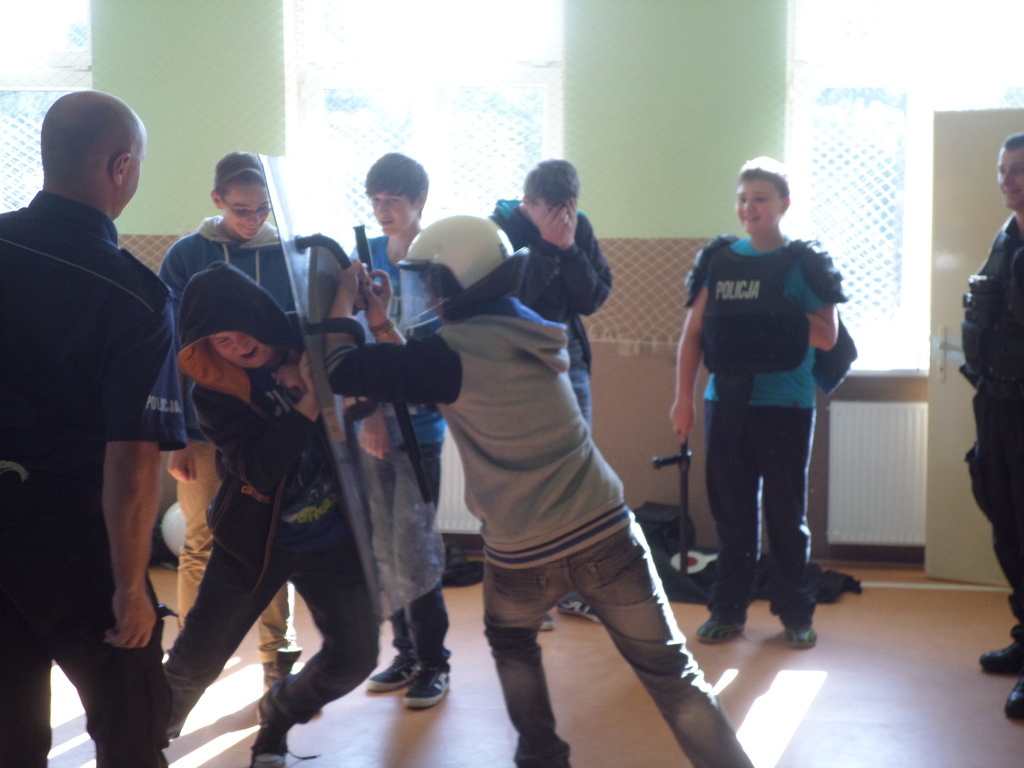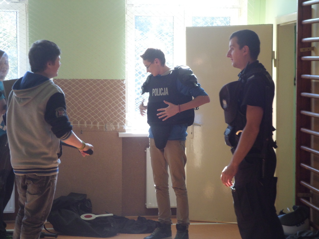 W środę 17 września 2014 r. odwiedzili naszą szkołę policjanci. Spotkanie zostało podzielone na dwa bloki: w pierwszym z nich uczestniczyli uczniowie klas 0-V, w drugim uczniowie klas VI - III gimnazjum. Podczas spotkania uczniowie dowiedzieli się o tym, jak bezpiecznie poruszać się po drogach, jak reagować, gdy pojawią się sytuacje dotyczące narkotyków. Szczególnym zainteresowaniem wśród dzieci i młodzieży cieszyła się prezentacja wyposażenia policyjnego niezbędnego podczas wykonywania pracy.