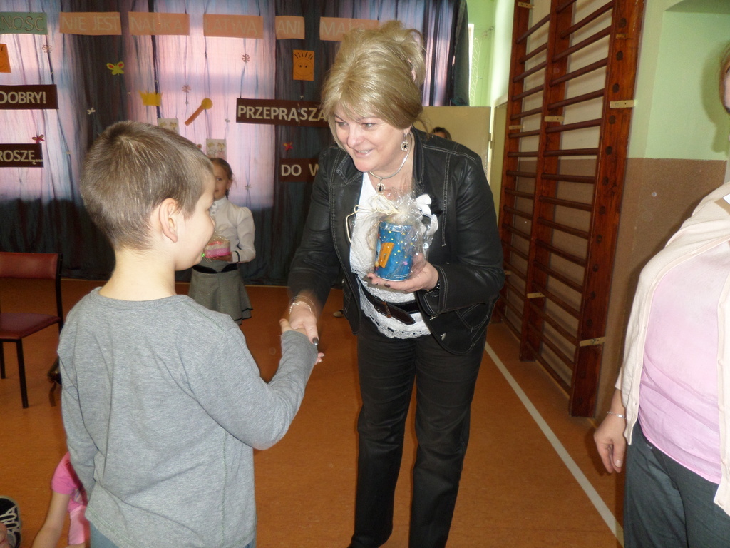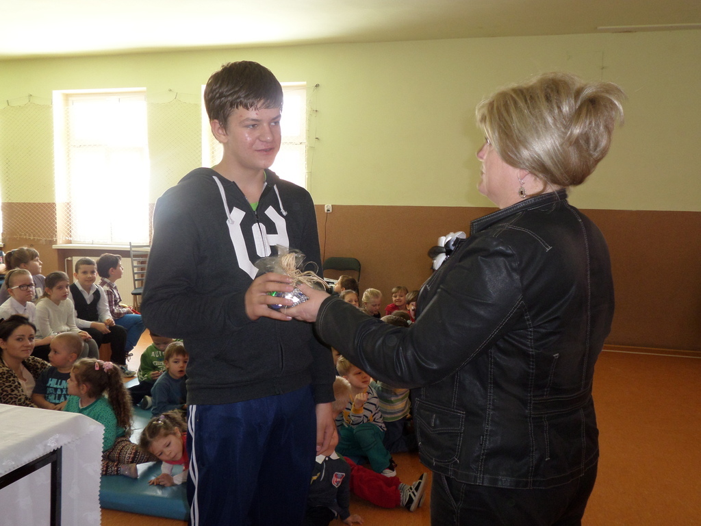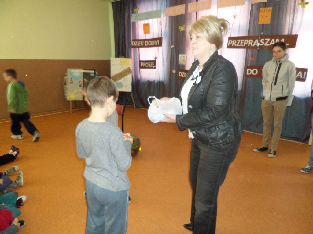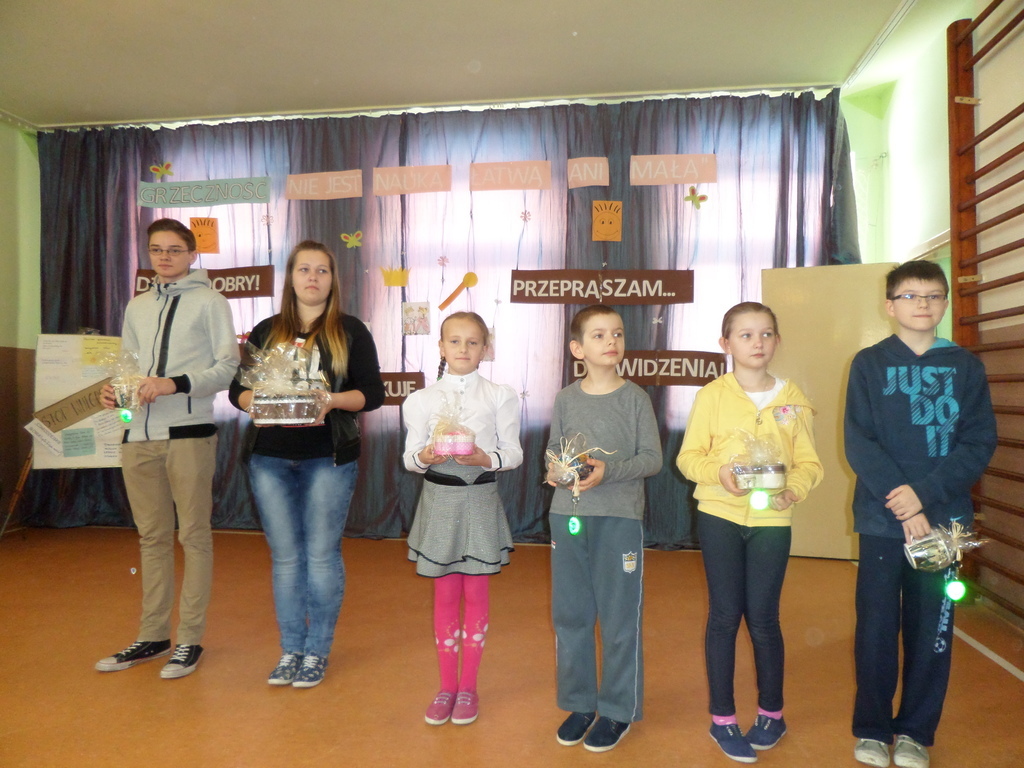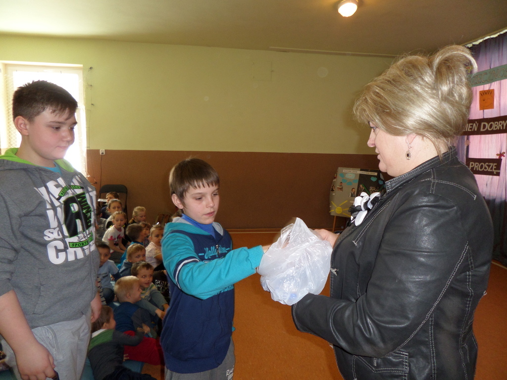 W piątek wszyscy uczniowie i nauczyciele spotkali się w sali gimnastycznej na podsumowaniu „Tygodnia Grzeczności”. Zwycięzcy konkursów i plebiscytów otrzymali nagrody, które wręczała pani dyrektor. Uczniowie klas I, II, III oraz przedszkolacy zaprezentowali program artystyczny.