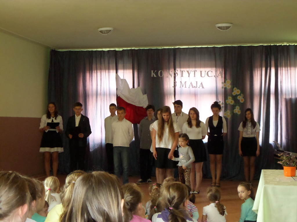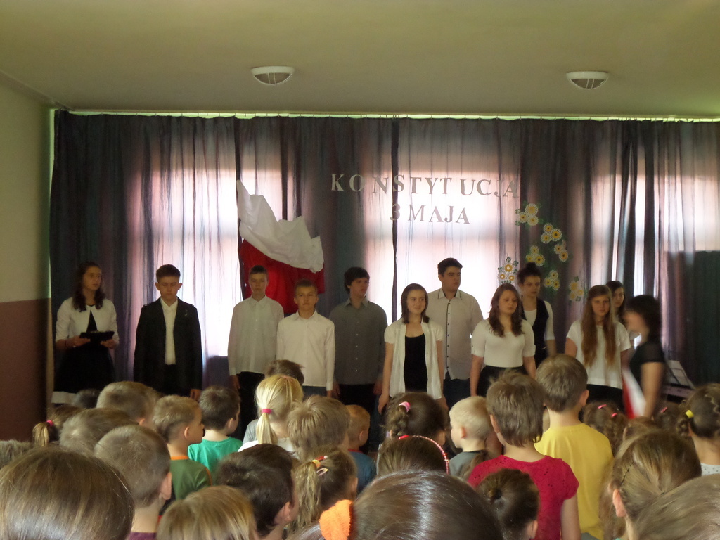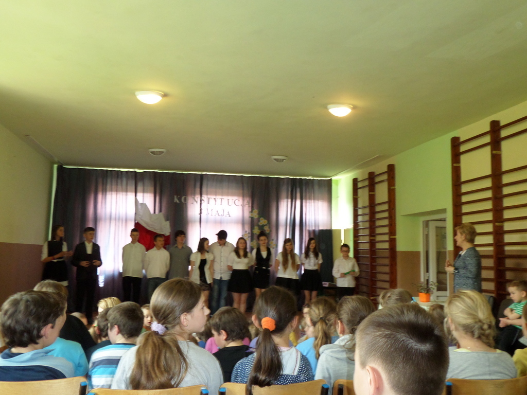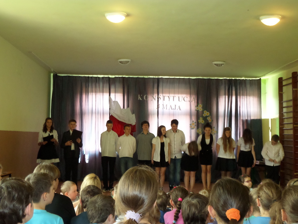 Uczniowie klas I i II gimnazjum zaprezentowali montaż słowno-muzyczny, w którym przypomnieli okoliczności i przebieg wydarzeń z 1791 roku. Podniosła i patriotyczna atmosfera towarzyszyła recytacjom oraz piosenkom prezentowanym na scenie.