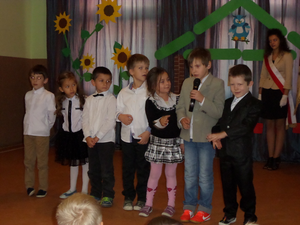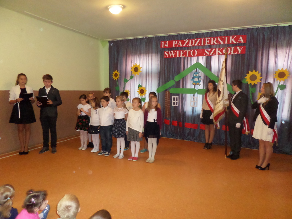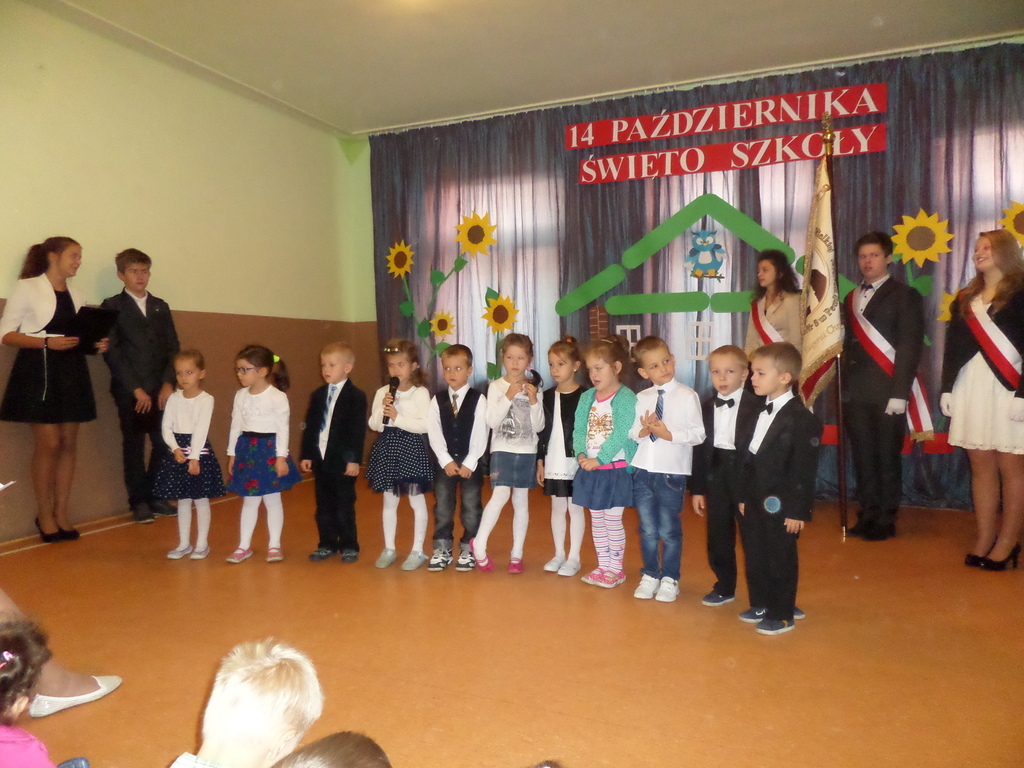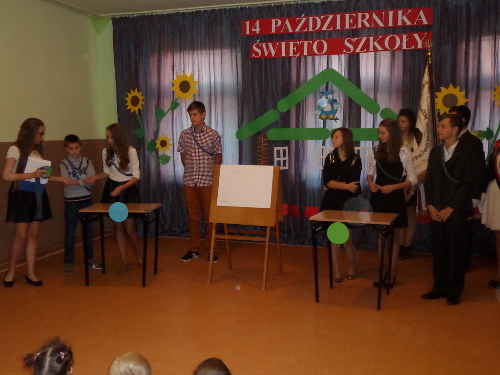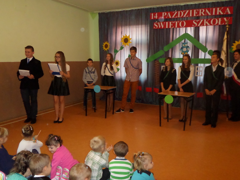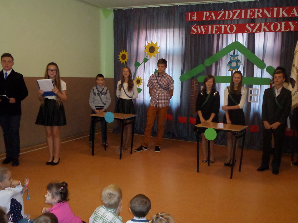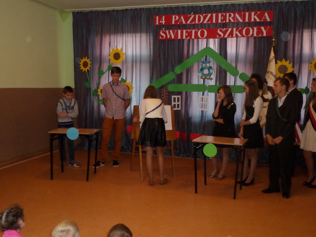 14 października 2015 r. wszyscy uczniowie, nauczyciele i rodzice spotkali się, aby wspólnie świętować Dzień Nauczyciela. Uczniowie przygotowali słowa podziękowań i życzeń dla wszystkich, którzy związani są z pracą w szkole. Byla to również okazja do złożenia ślubowania przez uczniów klasy pierwszej szkoły podstawowej oraz pierwszej gimnazjum. Na pełnoprawnych przedszkolaków pasowani zostali uczniowie klasy "0".