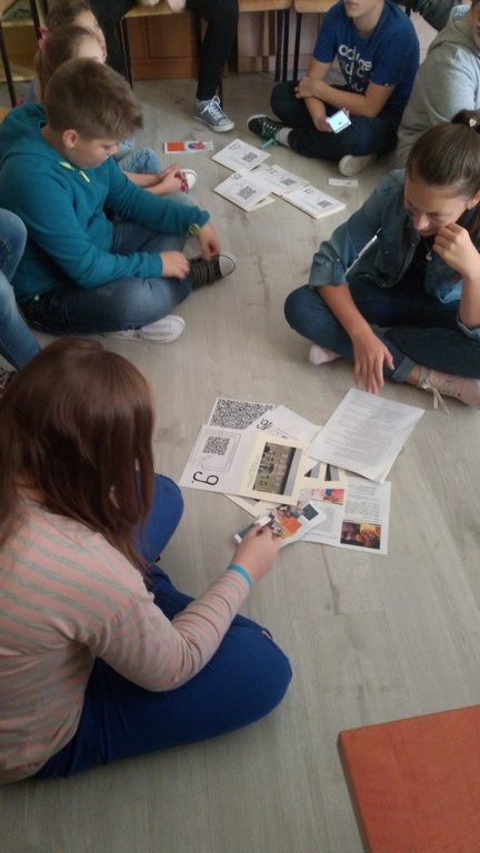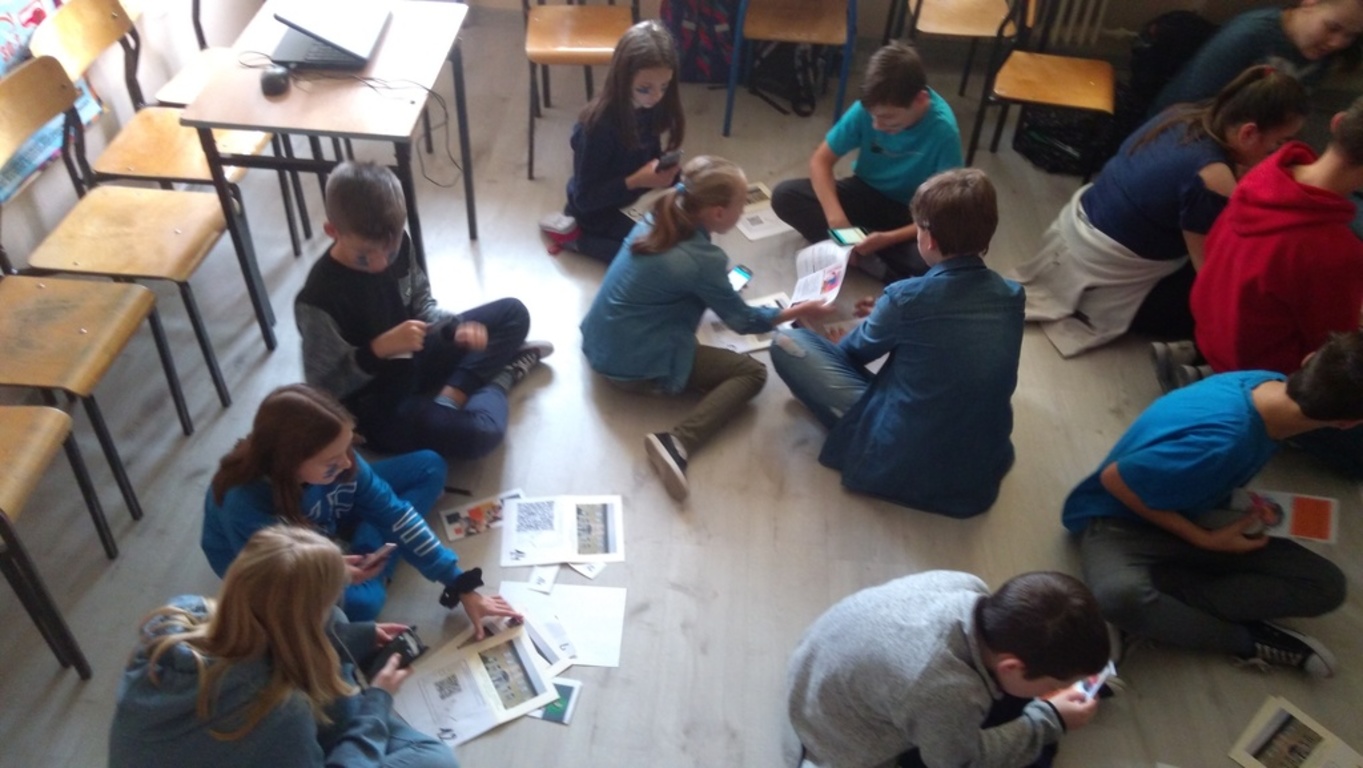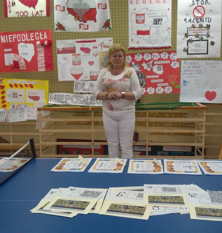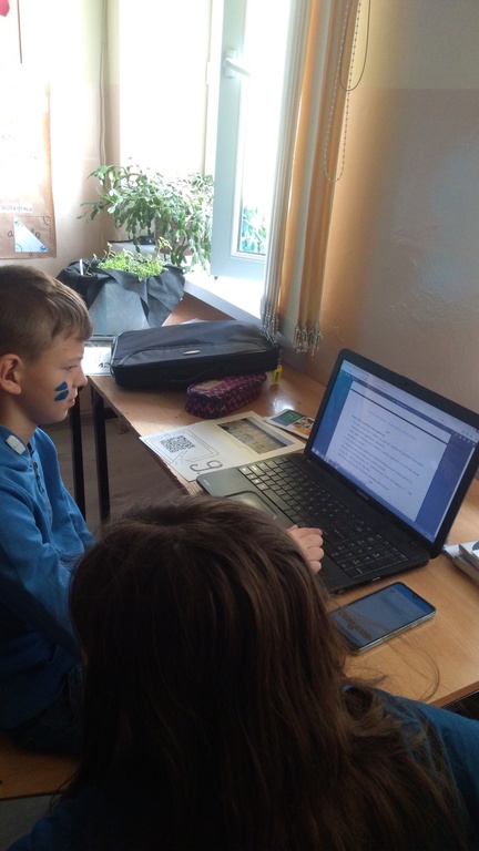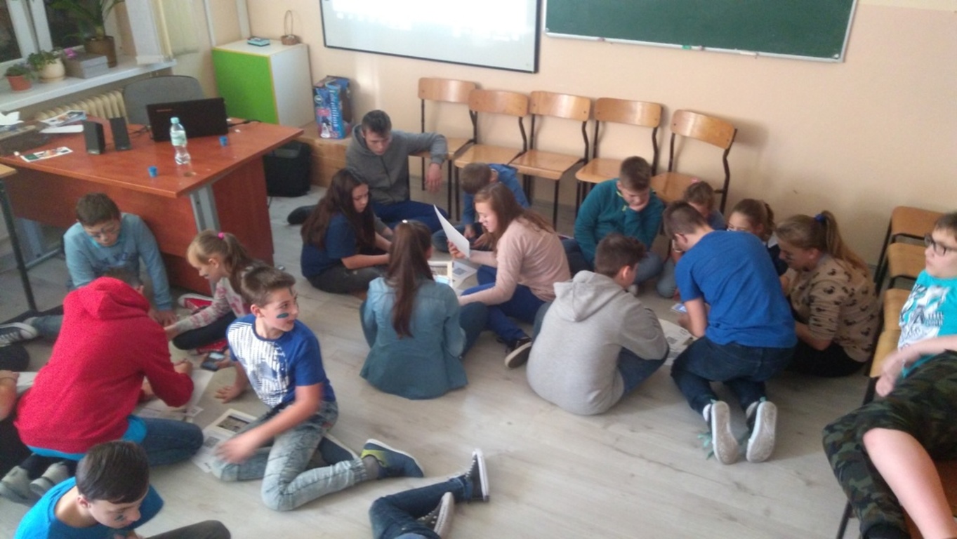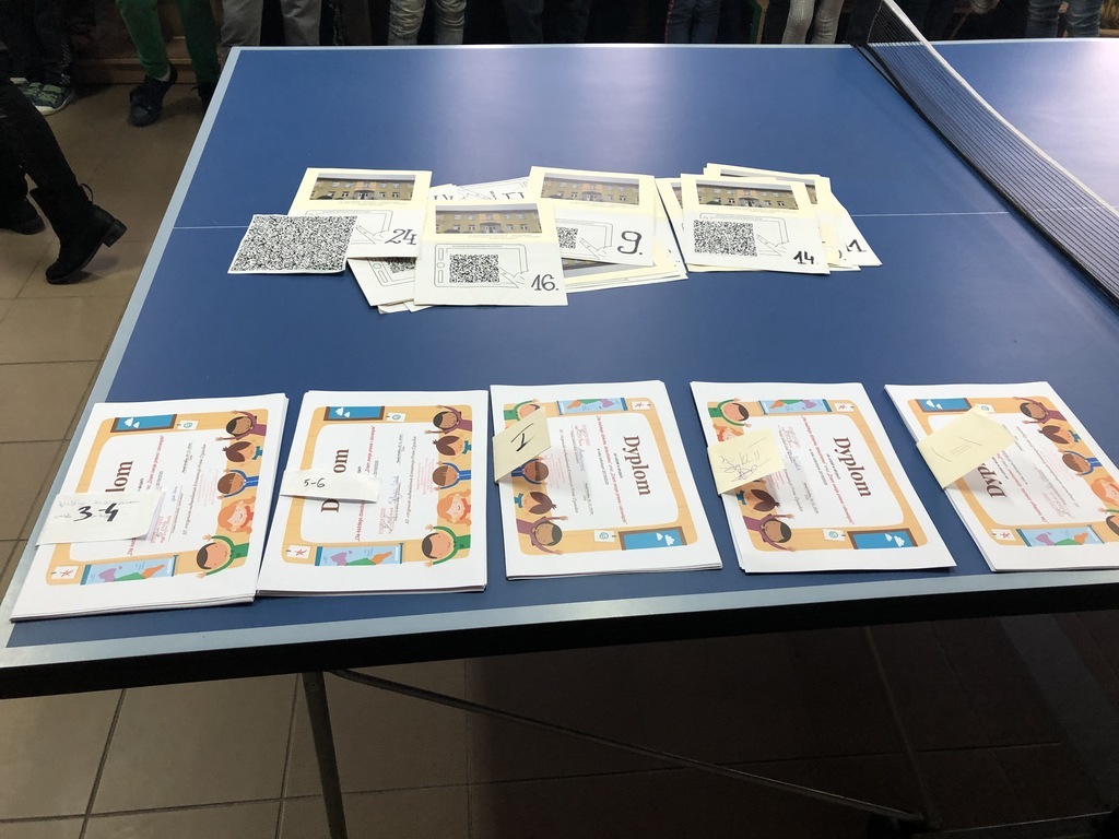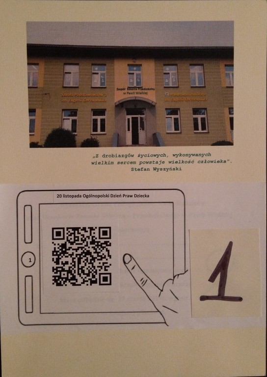 - Została przygotowana gra terenowa z użyciem kodów QR, która pozwalała na aktywne poznanie i zapamiętanie ogólnoświatowych oraz szkolnych praw dziecka. W tym dniu wybrani uczniowie wyjątkowo przynieśli do szkoły smartfony, które zawierały czytnik kodów QR. Przed rozpoczęciem zabawy prowadzący schował karty z pytaniami w różnych zakątkach budynku placówki. Uczniowie, którzy zostali podzieleni na grupy, musieli odnaleźć wylosowane zadania, a następnie za pomocą skanera kodów QR odczytać pytania i zadania. Treści poleceń sprawdzały wiedzę na temat praw i obowiązków dziecka oraz dziecka – ucznia. W trakcie rozwiązywania zadań, uczniowie korzystali m.in. z zapisów Konwencji o prawach dziecka oraz Statutu Zespołu. Na koniec turnieju reprezentanci grup odczytali wyniki swojej pracy.