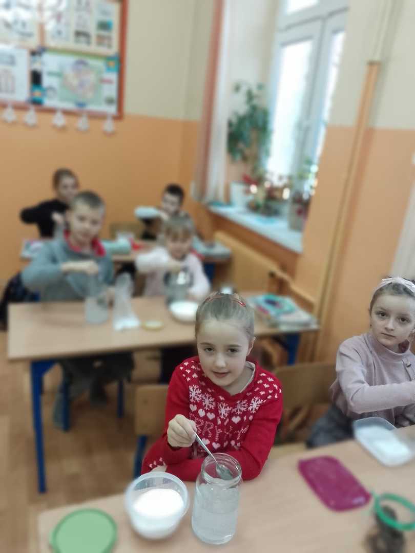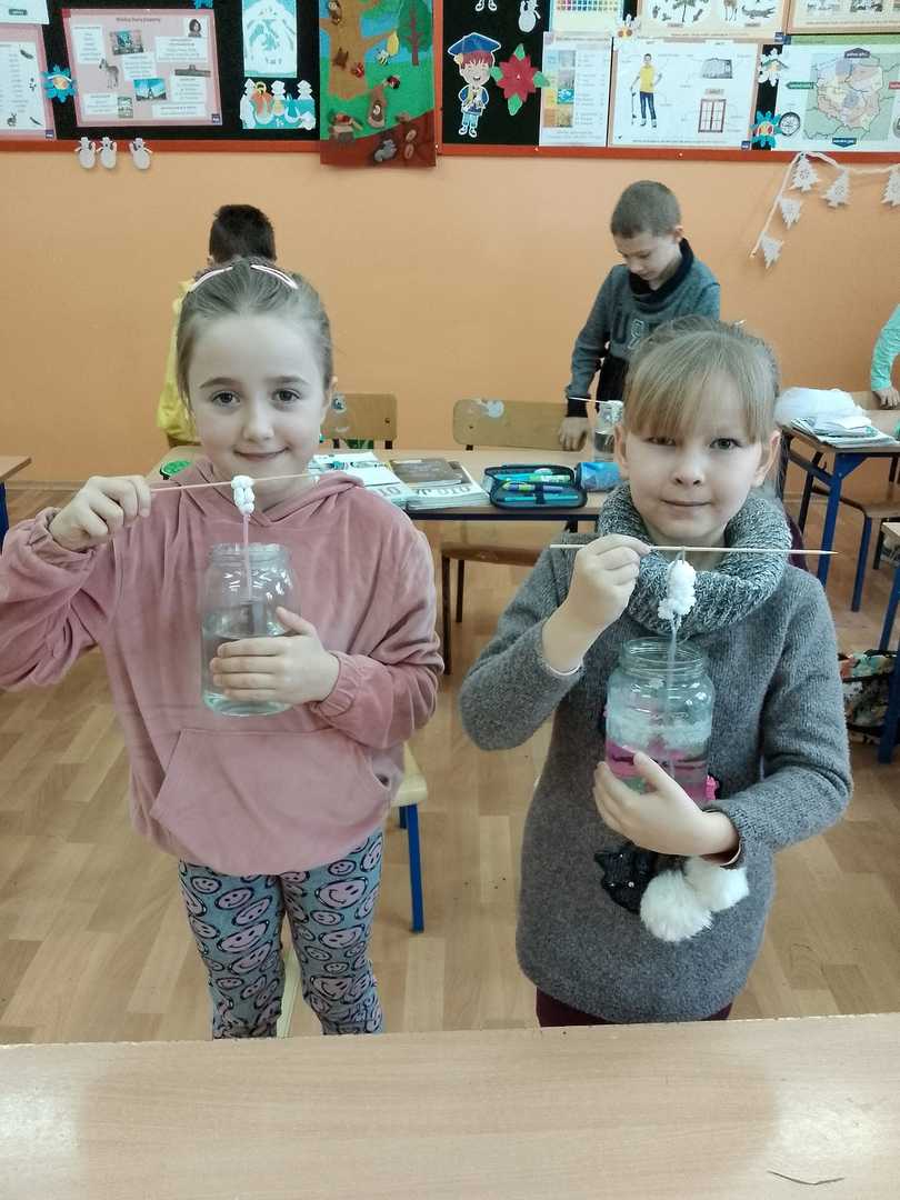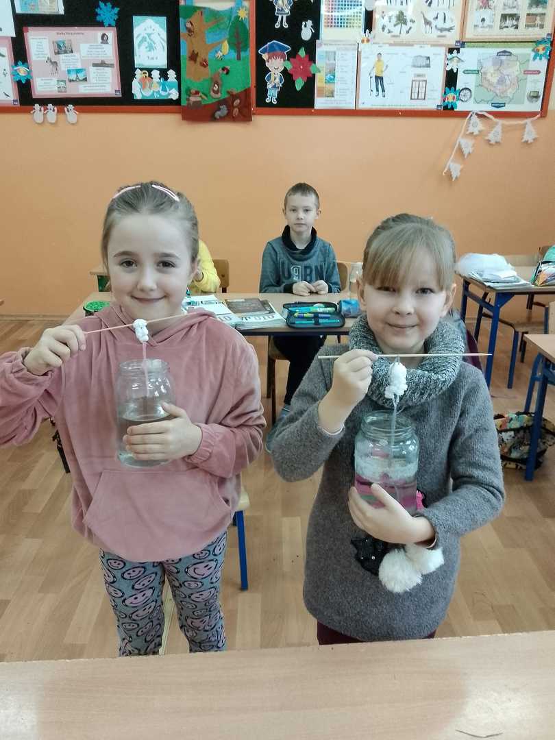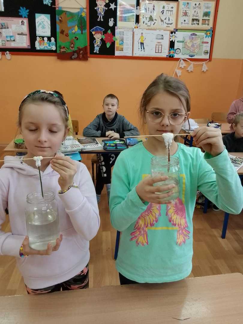 Uczniowie klasy drugiej na zajęciach przyrodniczych mieli okazję przeprowadzić doświadczenie krystalizacji soli. Na pierwsze efekty trzeba było poczekać kilkanaście dni, a cały proces trwał aż trzy tygodnie i nadal trwa. Jednak opłacało się czekać, gdyż uzyskane efekty zaskoczyły wszystkich.