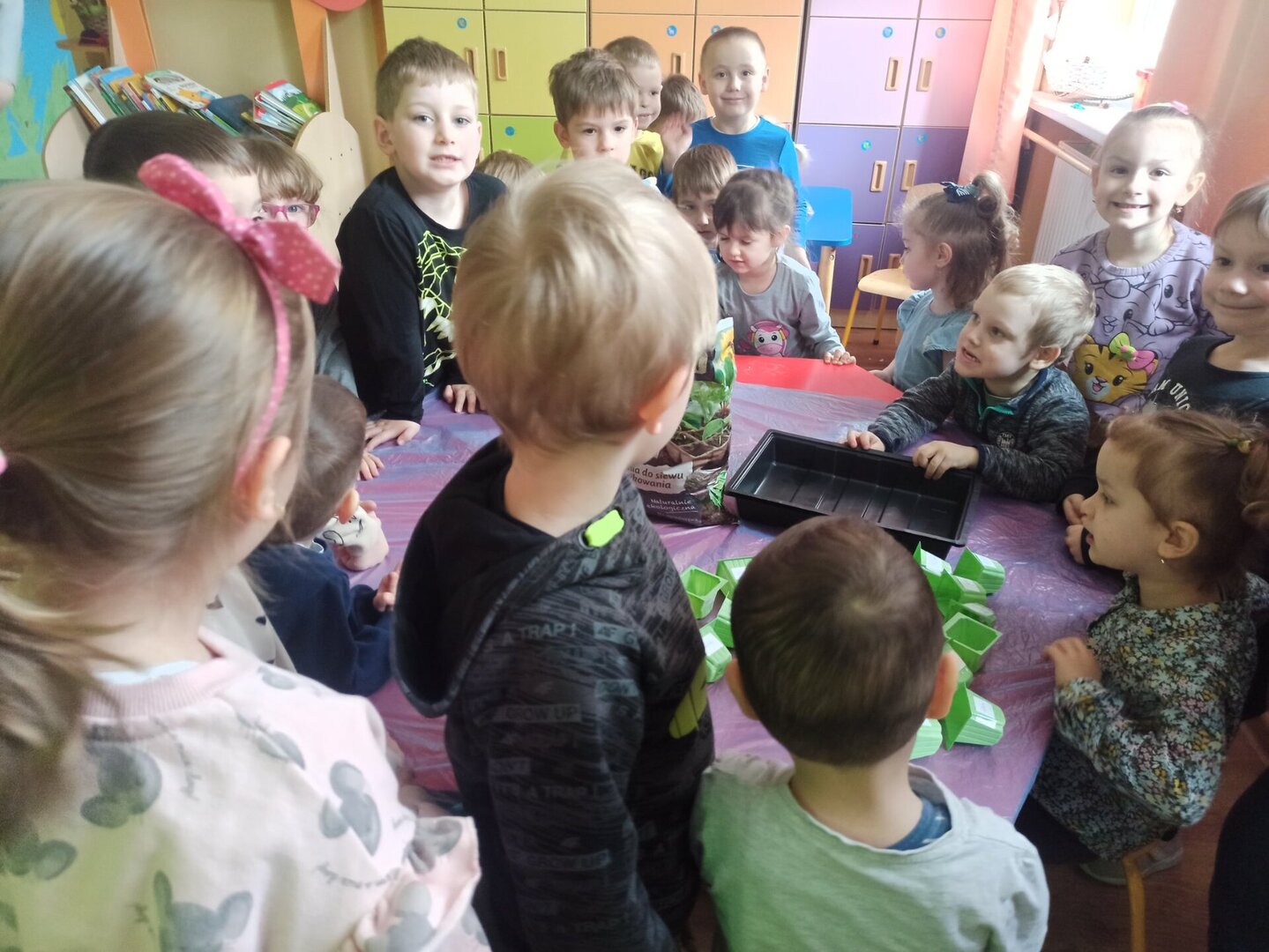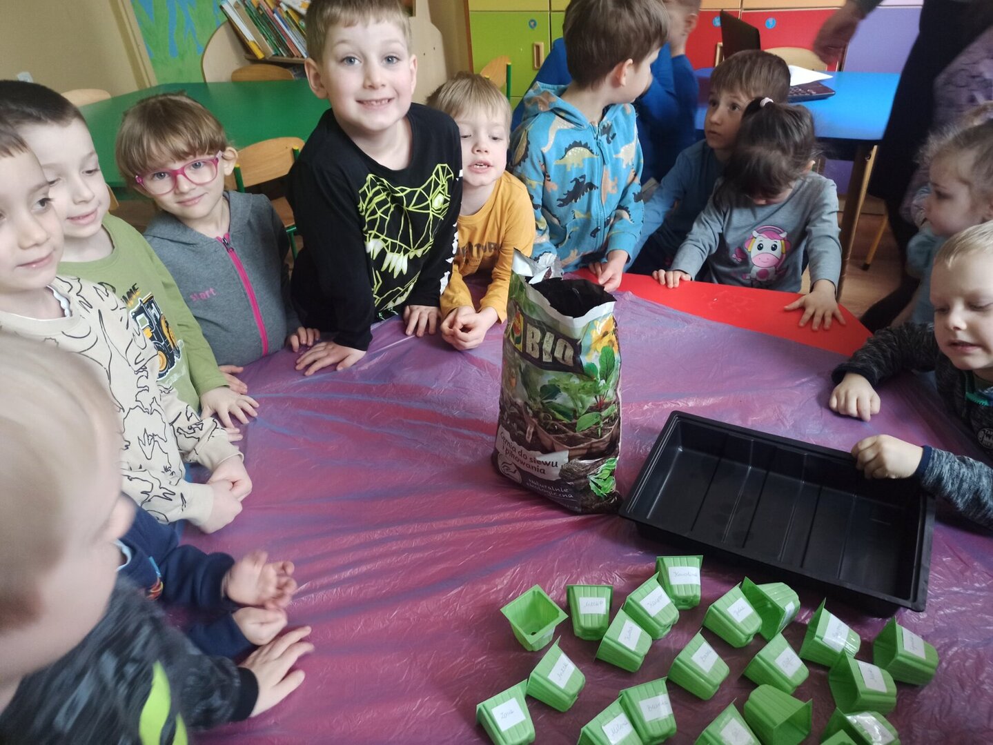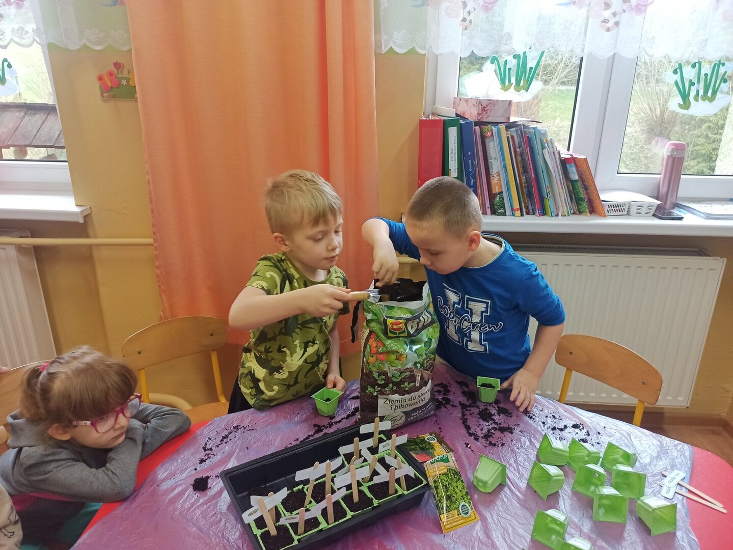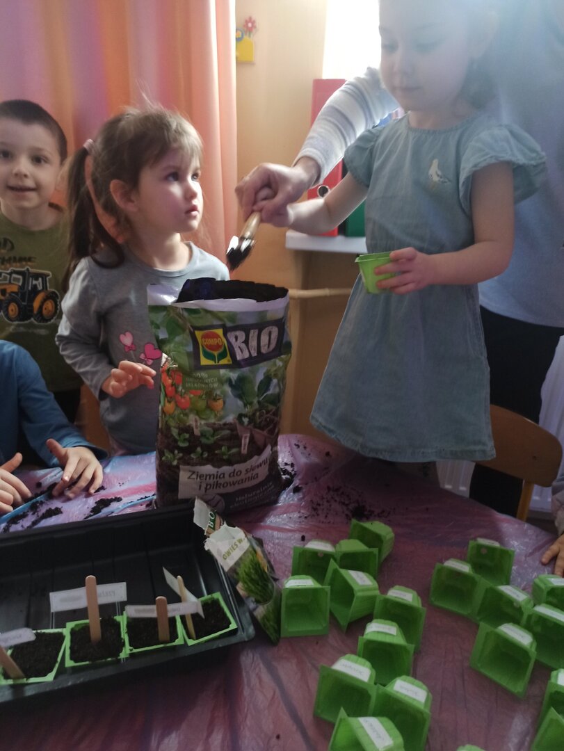 Przedszkolaki wraz z przyjściem wiosny postanowiły założyć w sali wiosenny ogródek. Zgromadziły potrzebne doniczki, przybory, ziemię, nasionka. Przed przystąpieniem do pracy dzieci obejrzały film edukacyjny, dzięki któremu poznały warunki potrzebne roślinom do wzrostu. Następnie siały rzeżuchę, pietruszkę, owies i szczypiorek. Po zasianiu i podlaniu roślinki zostały umieszczone w kąciku przyrody. Przedszkolaki, pamiętając o ich podlewaniu, będą obserwowały ich wzrost. Kiedy wyrosną, będą źródłem witamin i ozdobą sali.