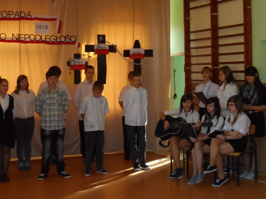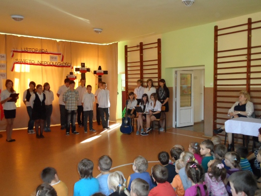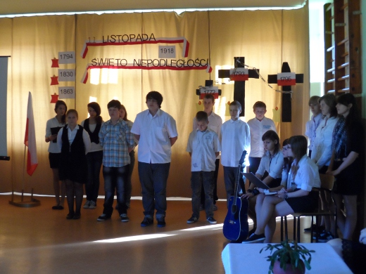 Uczniowie klasy I gimnazjum wraz z kolegami z klasy VI opowiedzieli o utracie niepodległości oraz drodze do jej odzyskania. Pieśni żołnierskie i legionowe, podniosłe recytacje oraz multimedialna prezentacja przybliżyły nam historię Ojczyzny, która cieszy się niepodległością od 11 listopada 1918 r.